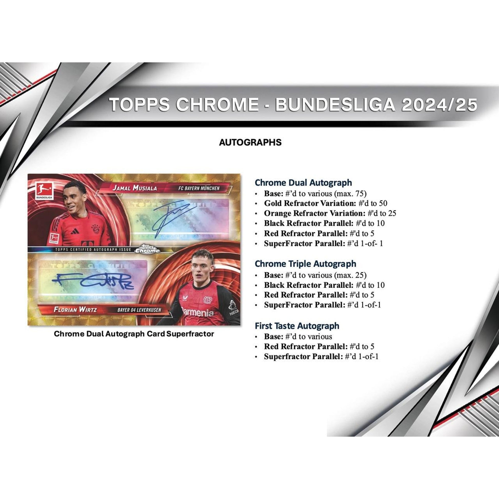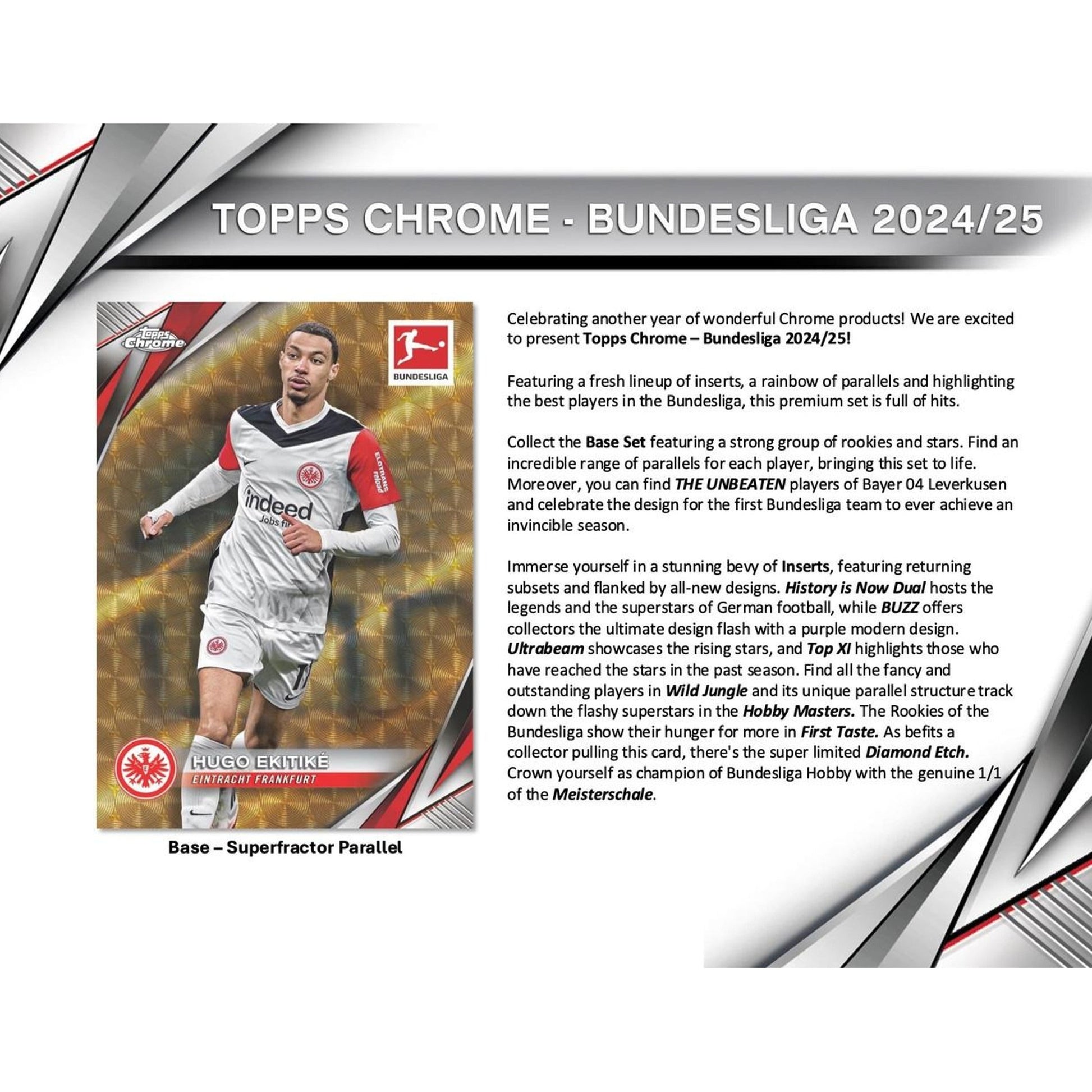 Featuring stunning designs, a rainbow of parallels, and ultra-rare 1/1 chase cards, Topps Chrome Bundesliga delivers premium content for collectors at every level.