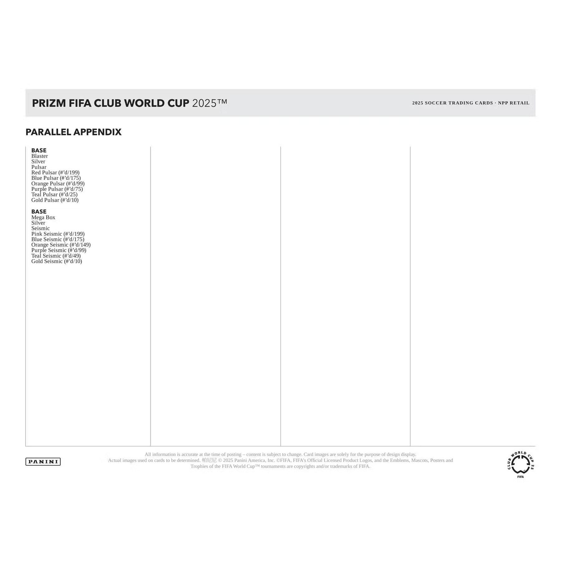 The debut trading card collection for the FIFA Club World Cup is coming this year in Prizm form! Collect a 200-card base set featuring players from over 25 qualified teams including Manchester City, Chelsea FC, Real Madrid, Juventus, and more! Look for 1 Blaster-exclusive numbered Pulsar parallel per box, on average.